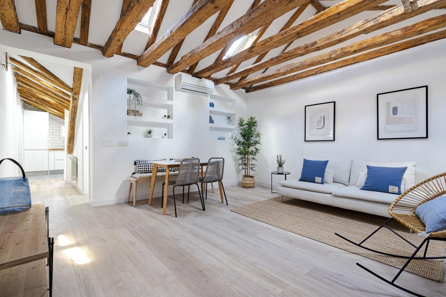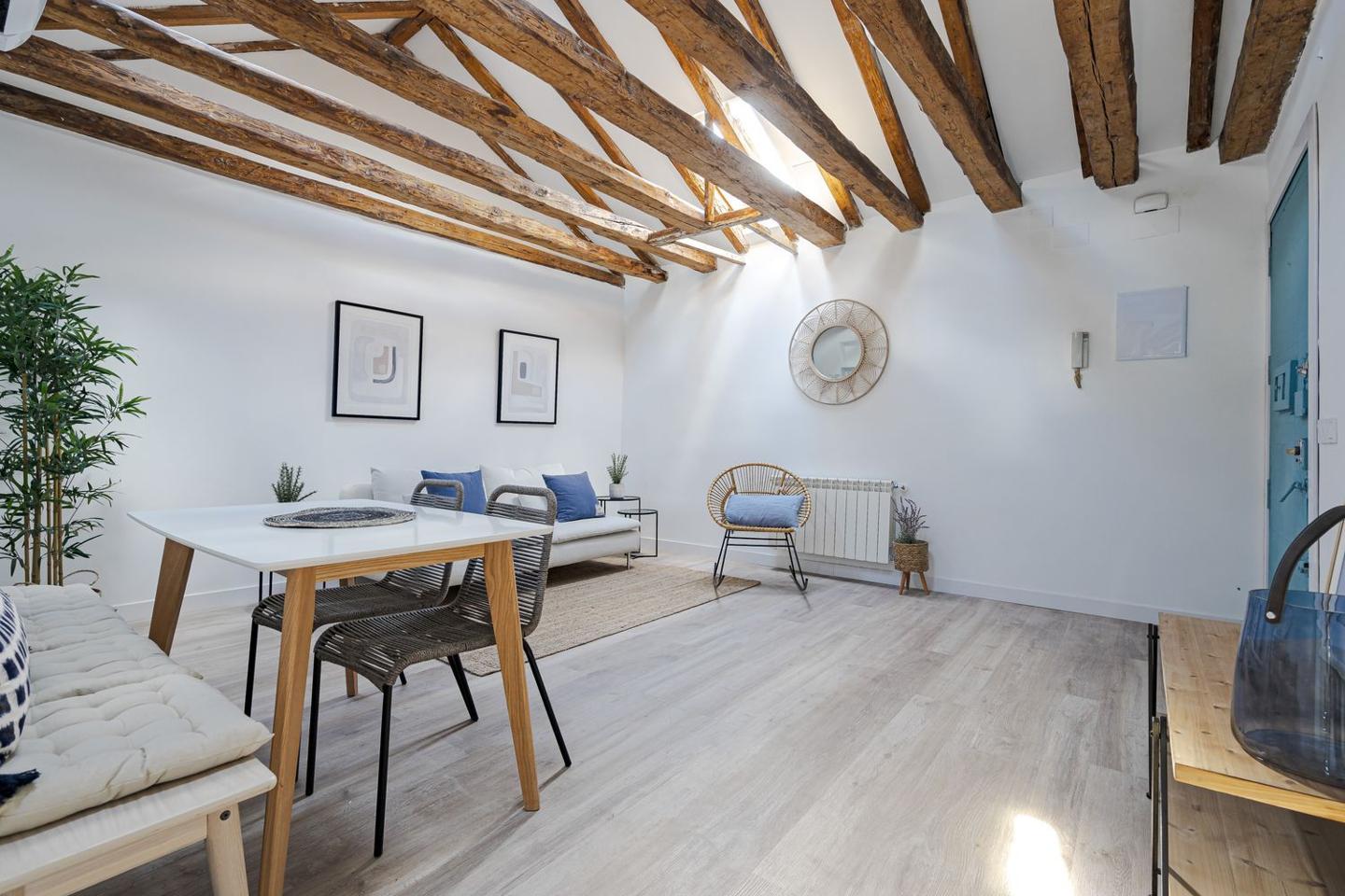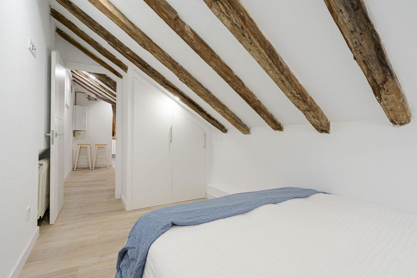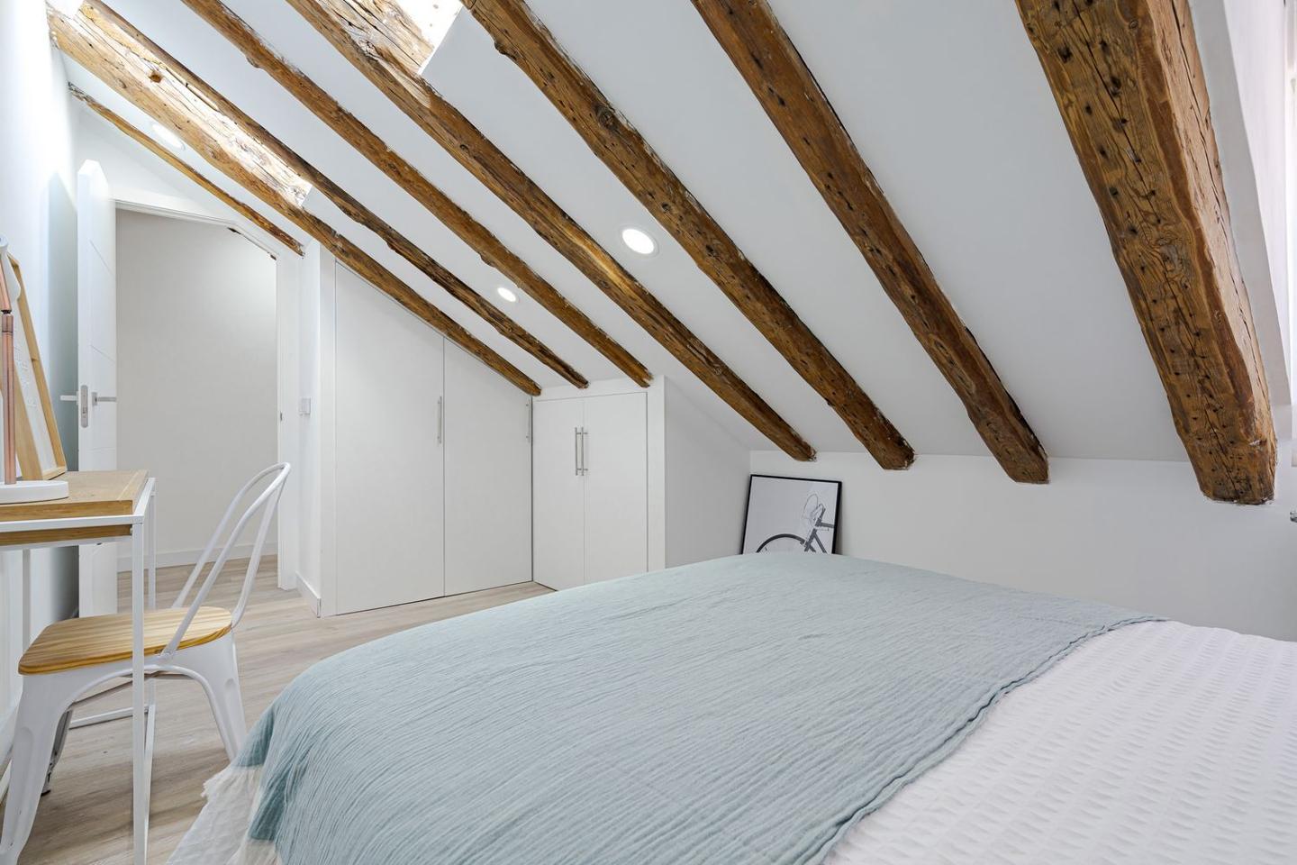 Sevenday presenta este espectacular ático abuhardillado en pleno corazón de Malasaña combina estilo urbano, luz natural y un diseño funcional, ofreciendo una vivienda única para vivir o trabajar en una de las zonas más vibrantes de Madrid.La vivienda cuenta con una superficie de 83 m² que ha sido optimizada para permitir una circulación fluida entre estancias y una excelente sensación de amplitud. Al entrar, se aprecia una atmósfera luminosa, con espacios amplios y abiertas, perfectos para un estilo de vida cosmopolita.El salón es el centro de la vivienda, un espacio versátil que puede adaptarse tanto a zona de estar como a comedor o área de trabajo. Su configuración abuhardillada aporta carácter y calidez, integrándose con un ambiente moderno y acogedor.La cocina, equipada de forma práctica, se sitúa de manera funcional dentro del conjunto del salón, facilitando la vida cotidiana.El ático dispone de dos dormitorios confortables, diseñados para ofrecer tranquilidad y descanso, con suficiente espacio para almacenaje y luz natural, lo que los convierte en espacios íntimos dentro de la vivienda.El baño completo, bien equipado, sigue la línea actual del resto de la vivienda, con acabados modernos que combinan estética y funcionalidad.Situado en la quinta planta interior de un edificio clásico sin ascensor, este piso reformado destaca por su estética contemporánea y distribución bien resuelta.