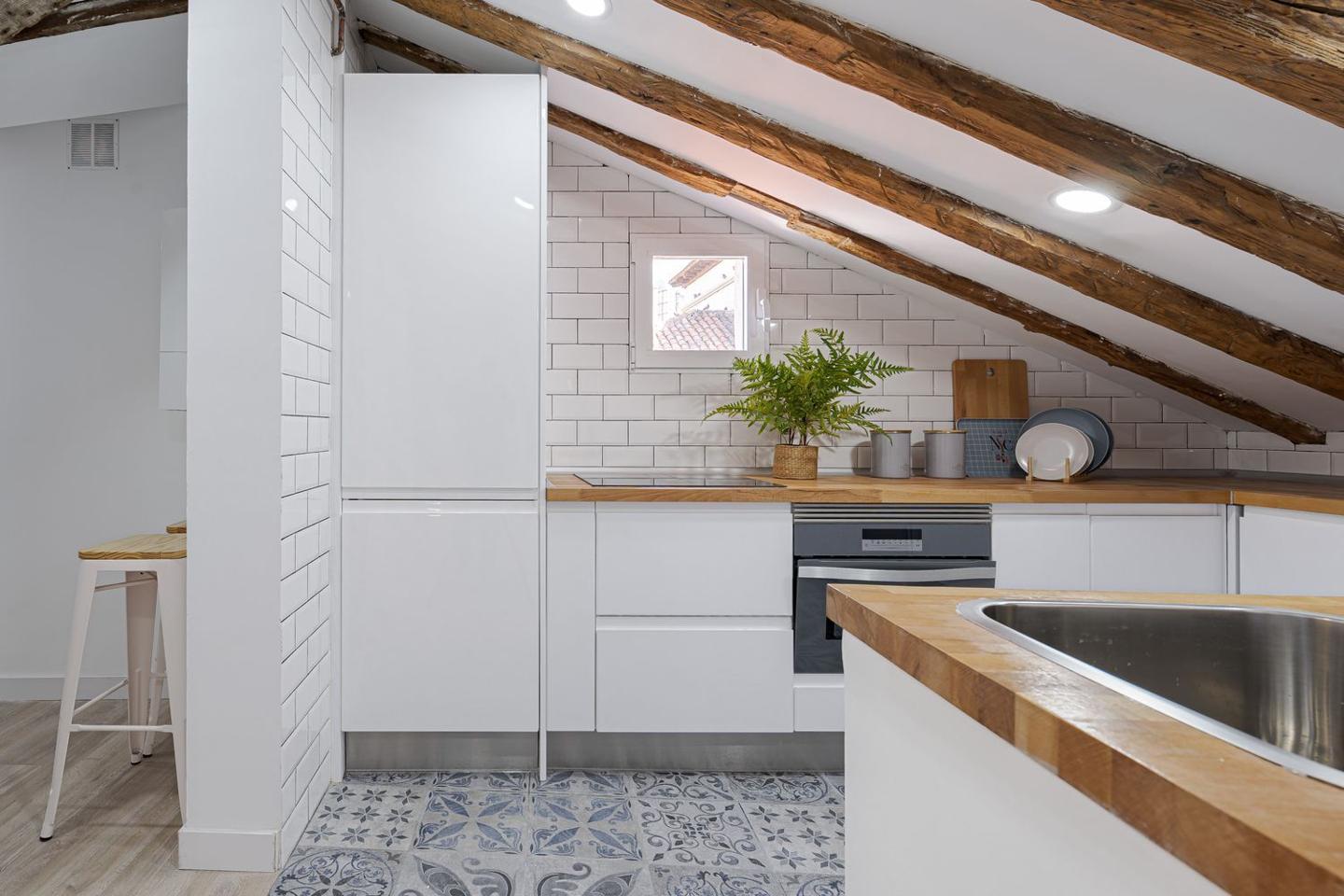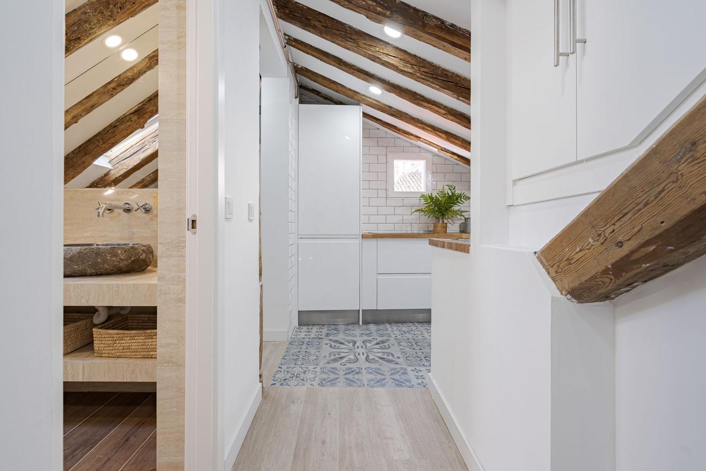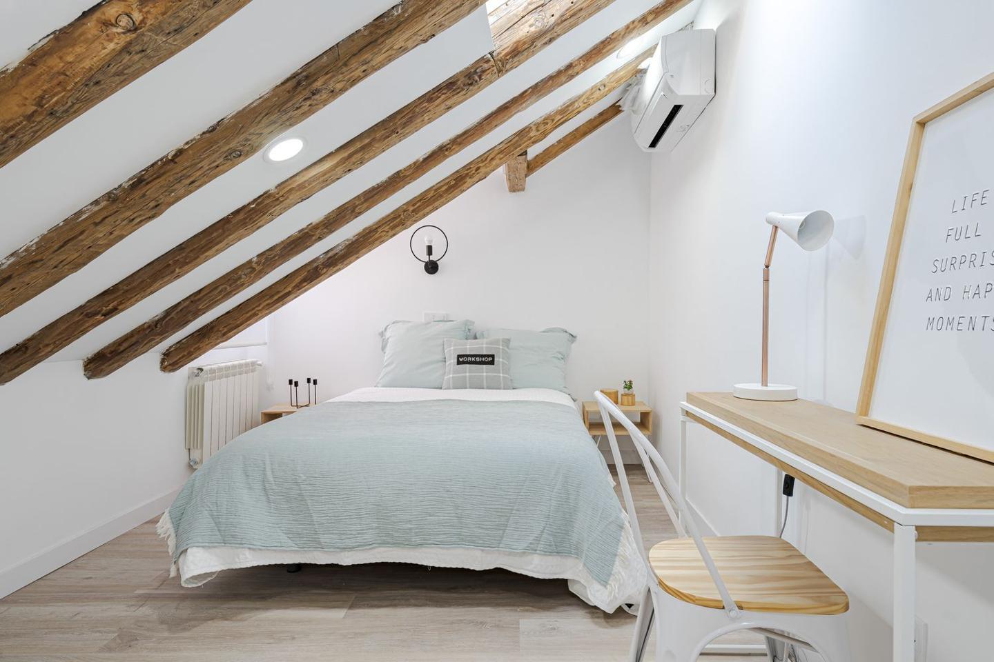 Sevenday presenta este espectacular ático abuhardillado en pleno corazón de Malasaña combina estilo urbano, luz natural y un diseño funcional, ofreciendo una vivienda única para vivir o trabajar en una de las zonas más vibrantes de Madrid.La vivienda cuenta con una superficie de 83 m² que ha sido optimizada para permitir una circulación fluida entre estancias y una excelente sensación de amplitud. Al entrar, se aprecia una atmósfera luminosa, con espacios amplios y abiertas, perfectos para un estilo de vida cosmopolita.El salón es el centro de la vivienda, un espacio versátil que puede adaptarse tanto a zona de estar como a comedor o área de trabajo. Su configuración abuhardillada aporta carácter y calidez, integrándose con un ambiente moderno y acogedor.La cocina, equipada de forma práctica, se sitúa de manera funcional dentro del conjunto del salón, facilitando la vida cotidiana.El ático dispone de dos dormitorios confortables, diseñados para ofrecer tranquilidad y descanso, con suficiente espacio para almacenaje y luz natural, lo que los convierte en espacios íntimos dentro de la vivienda.El baño completo, bien equipado, sigue la línea actual del resto de la vivienda, con acabados modernos que combinan estética y funcionalidad.Situado en la quinta planta interior de un edificio clásico sin ascensor, este piso reformado destaca por su estética contemporánea y distribución bien resuelta.